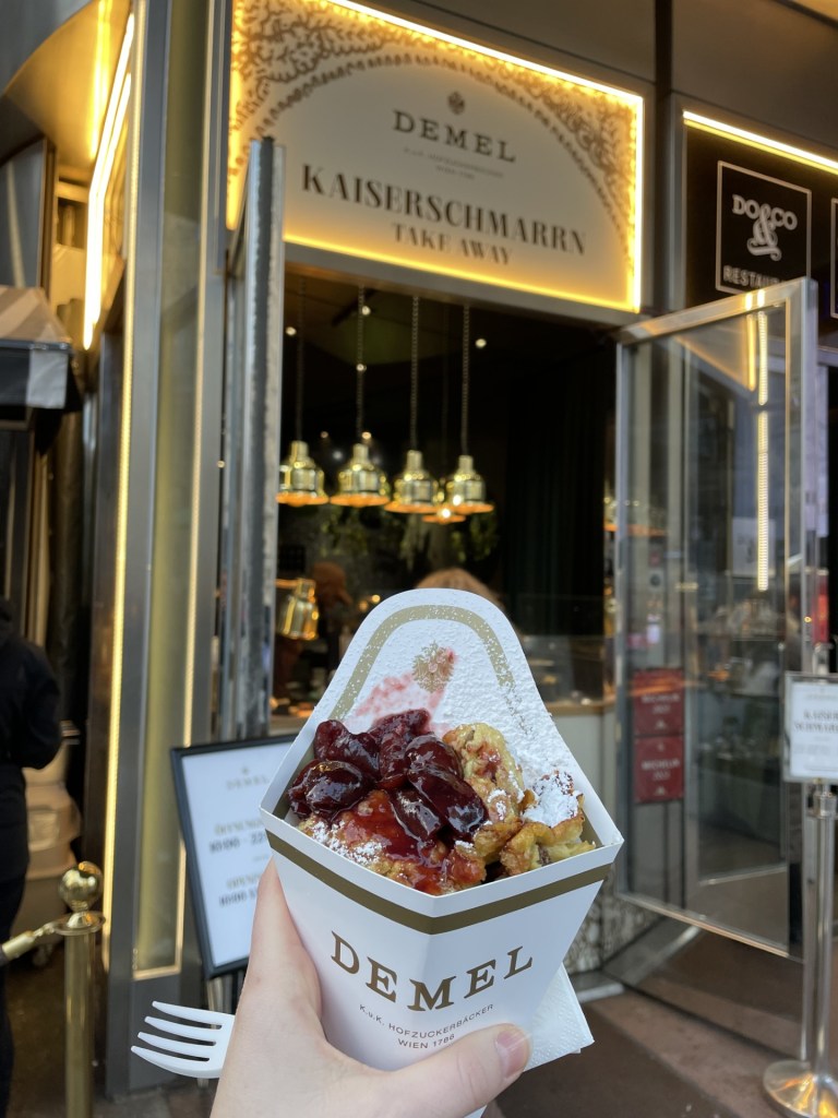 With the afternoon sunlight dwindling the only thing on my list was to see the iconic Saint-Etienne Cathedral and eat Kaiserschmarrn, an Austrian take on pancakes. You can tick them both off at once (and I highly recommend you do!) at Demel, a bakery that’s been around since 1786. Kaiserschmarrn is a dense but fluffy pancake that is chopped into bits and topped with a chunky plum sauce. This was perfect to clutch in my hands, especially in the colder evenings, as I took a slow lap and marveled at the outside of the cathedral.